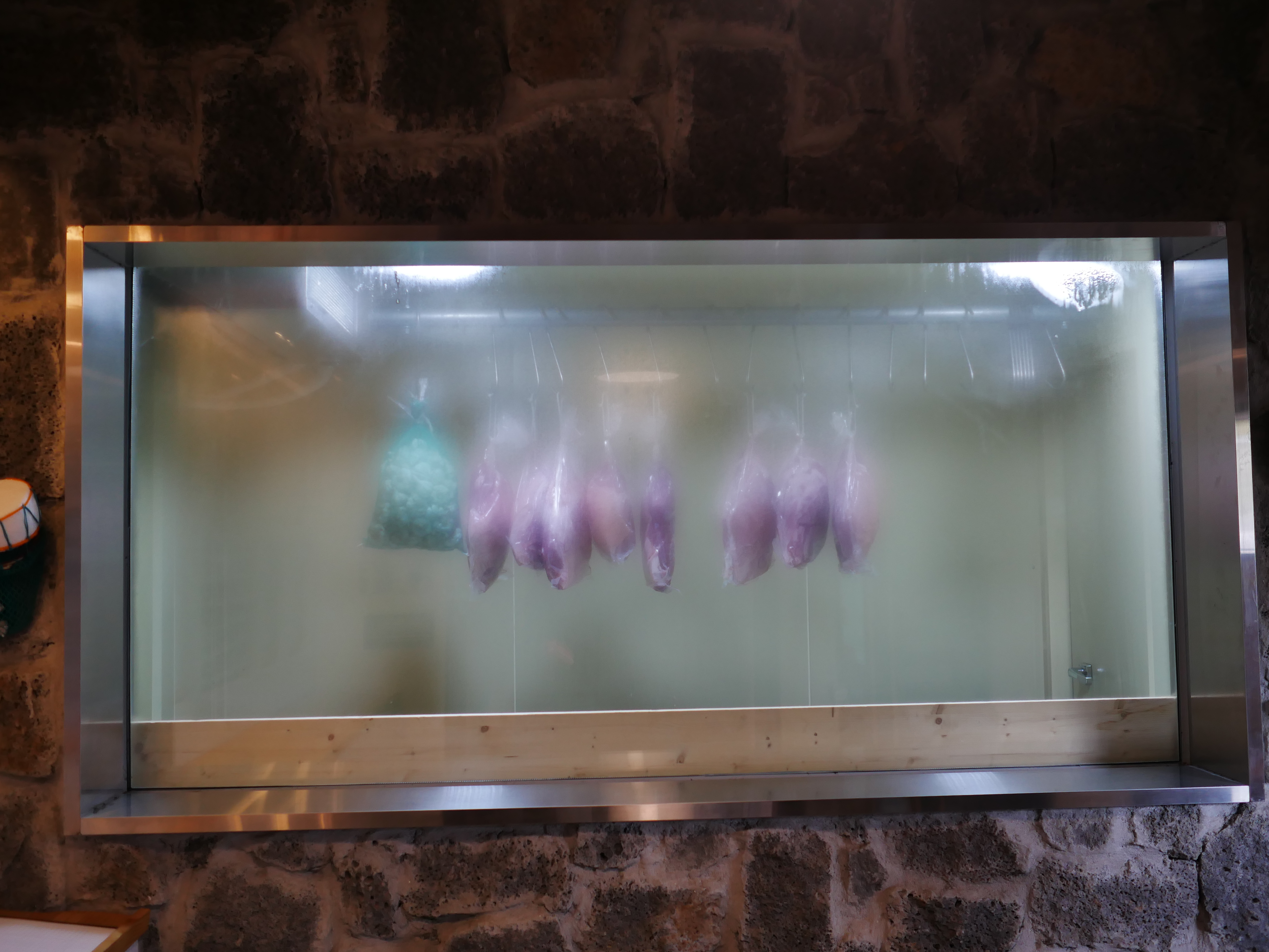 외부에 의자가 보이고 나무문을 열고 들어가면 정면에 숙성중인 고기가 보인다.